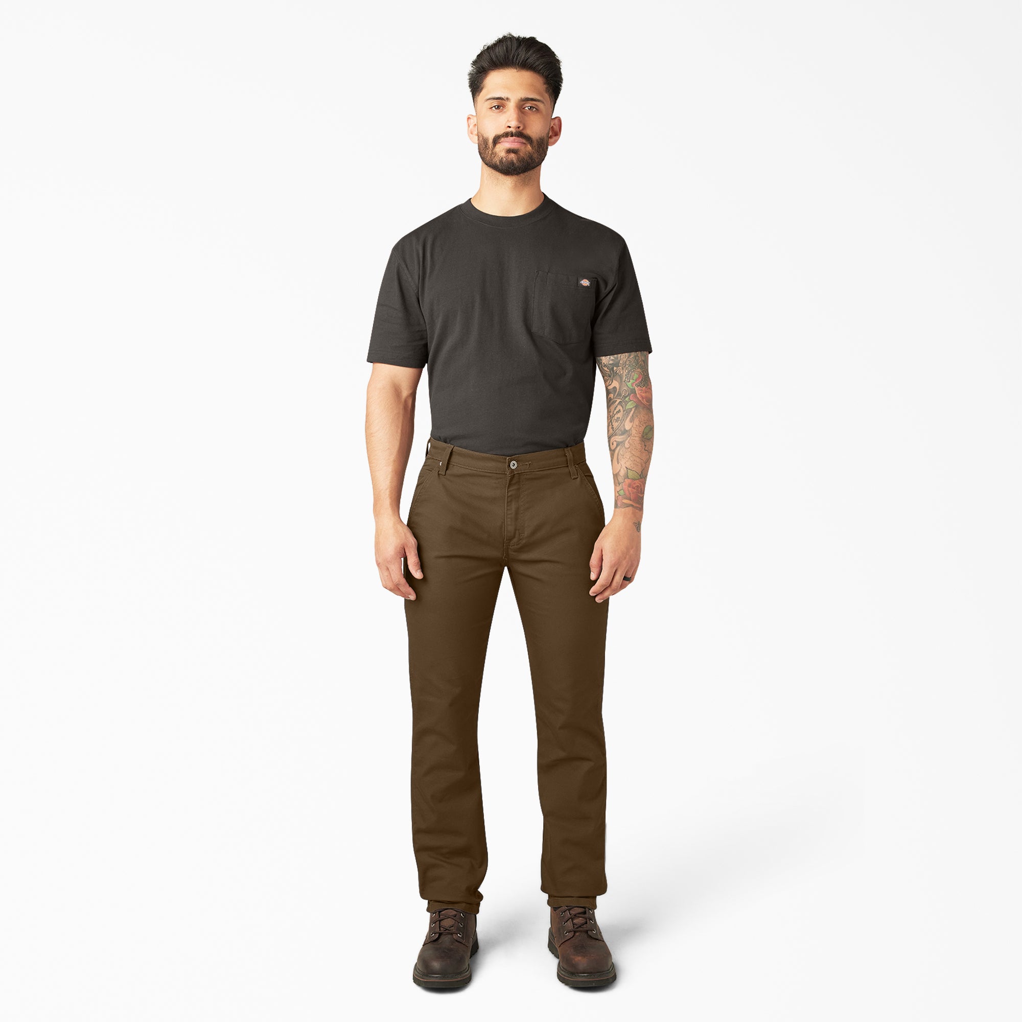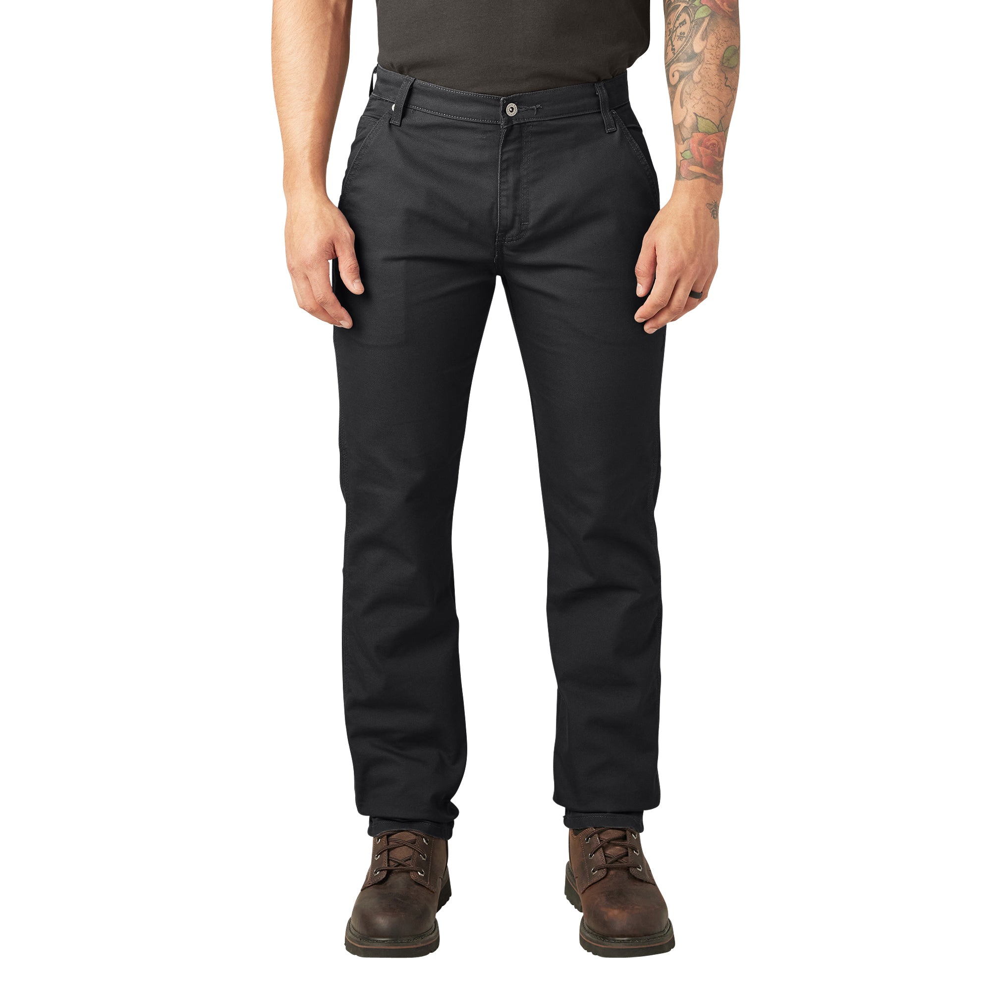 These Men's Regular Fit Duck Pants provide the durability you need for tough workplaces. They're designed in every way to optimize performance. Our TOUGH MAX™ technology incorporates superior ring-spun fabrics into the duck fabric, providing extra strength and comfort to ensure you can dive into any task with ease. Twice as strong as all-cotton fabric, these pants deliver exceptional abrasion resistance and durability. Dickies FLEX fabric technology also gives you the freedom to move with ease for whatever task you need to tackle. Storage is a cinch with five built-in pockets.