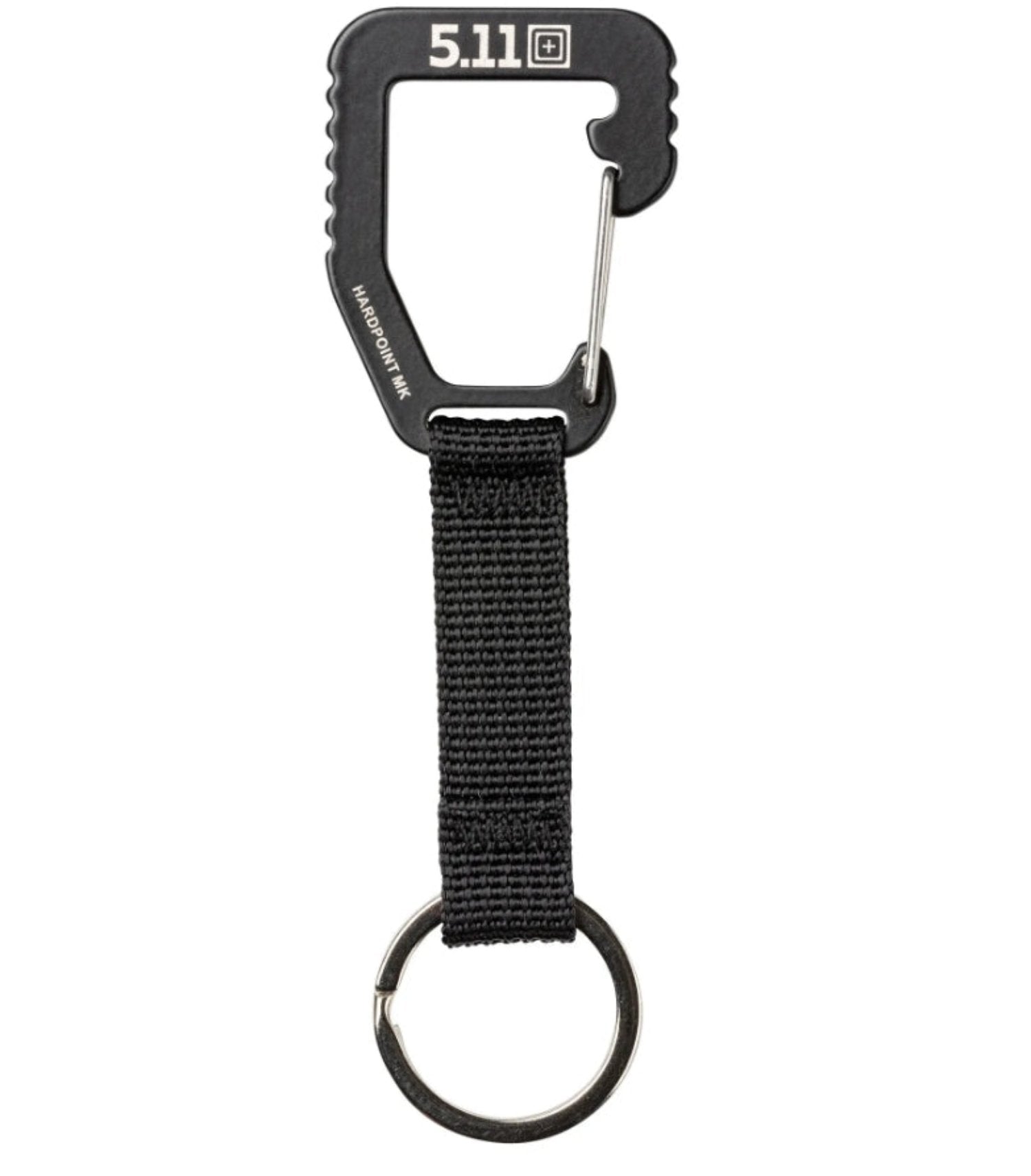 Hardpoint MK1 Carabiner Details The Hardpoint MK1 is the smallest of the Hardpoint series. A stainless steel-bodied carabiner with a wire gate, it is sized to fit on pant loops and similar attachment points. There’s also a webbing strap with a 1 in. strap pass-through and a split metal ring for keys or other small EDC items. It’s a handy little piece of hardware and good to have on hand.