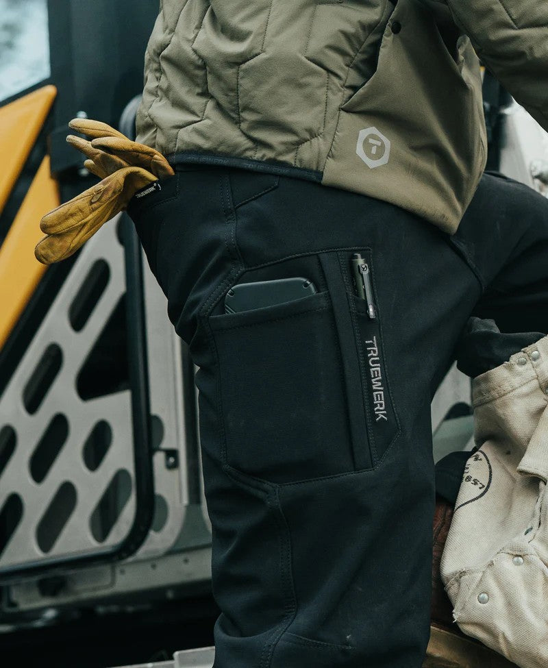 Designed to last longer, work smarter, and look sharper, TRUEWERK's best-selling sophisticated softshell pants are the new standard for 3-season, technical performance. TRUEWERK's proprietary double-woven softshell material enables us to combine a soft and durable inside with a tough and water resistant outside. Four-way stretch, double-stitched seams, windproof material, articulated knees, a gusseted inseam, and intelligent pocket design make these abrasion- and tear-resistant work pants the most technically advanced on the market.