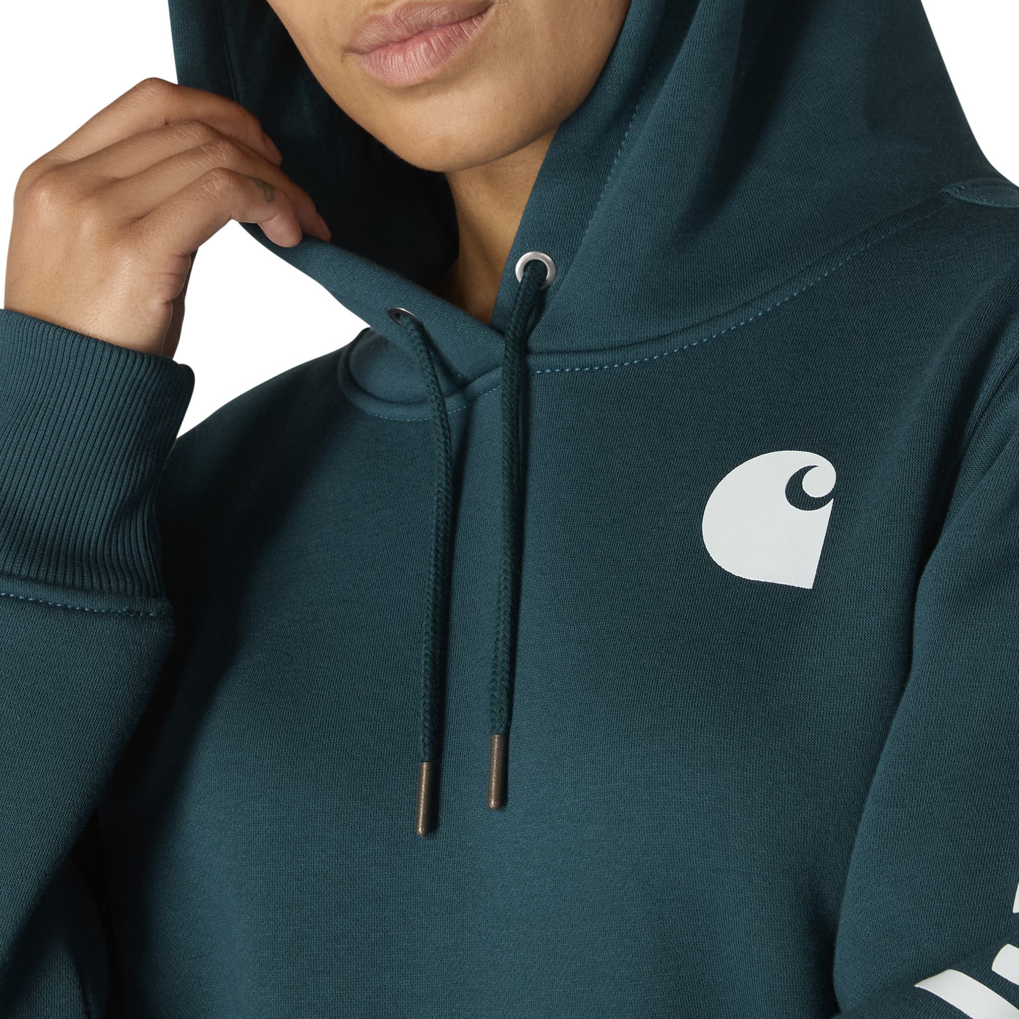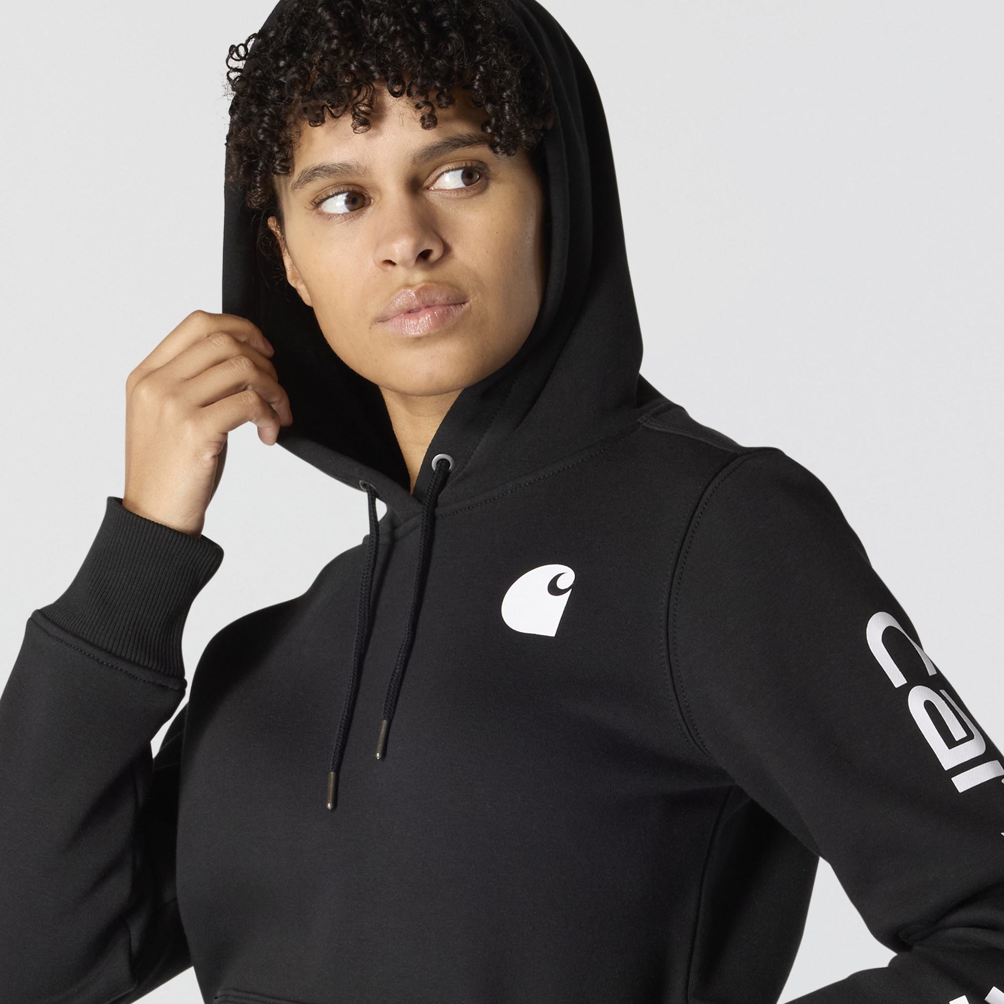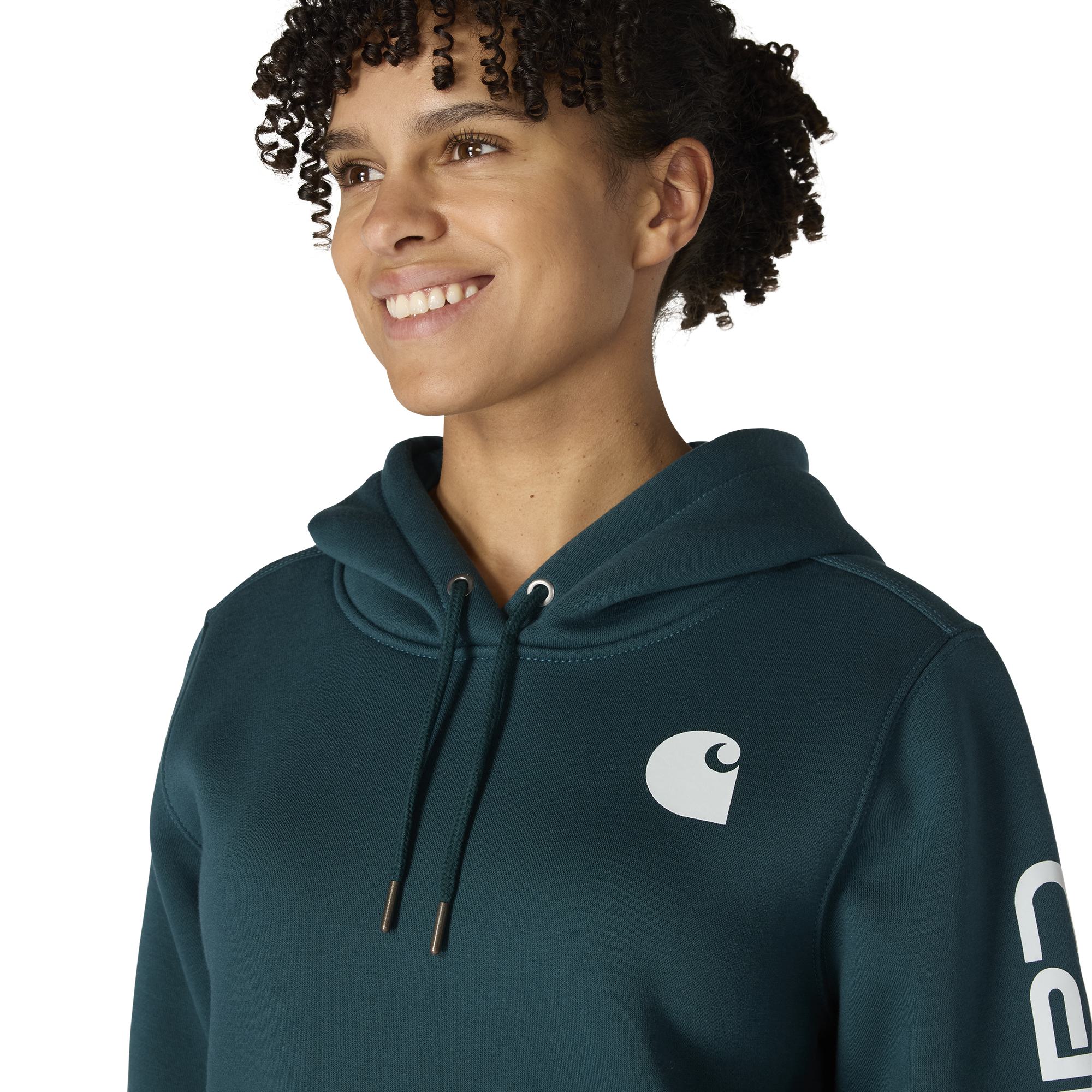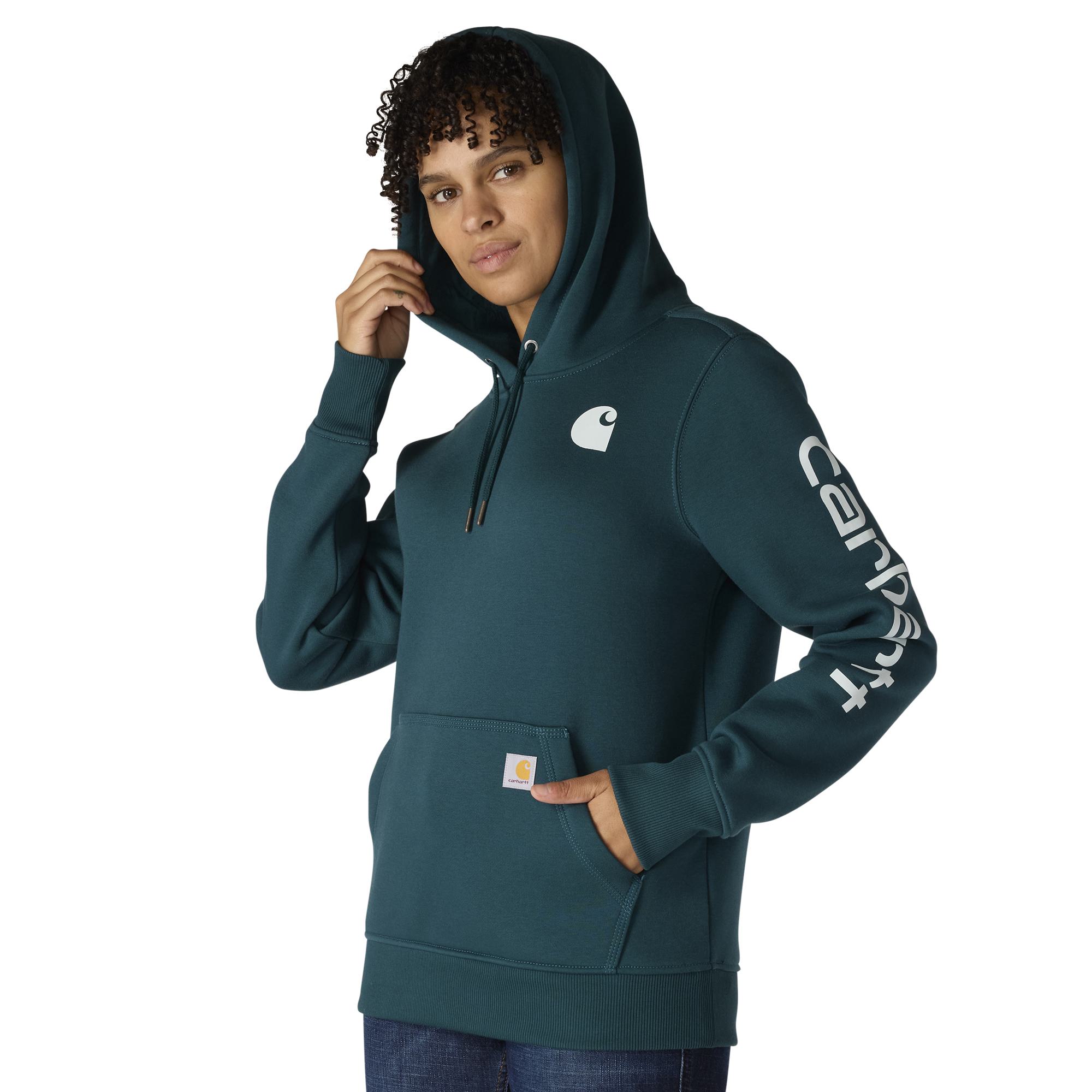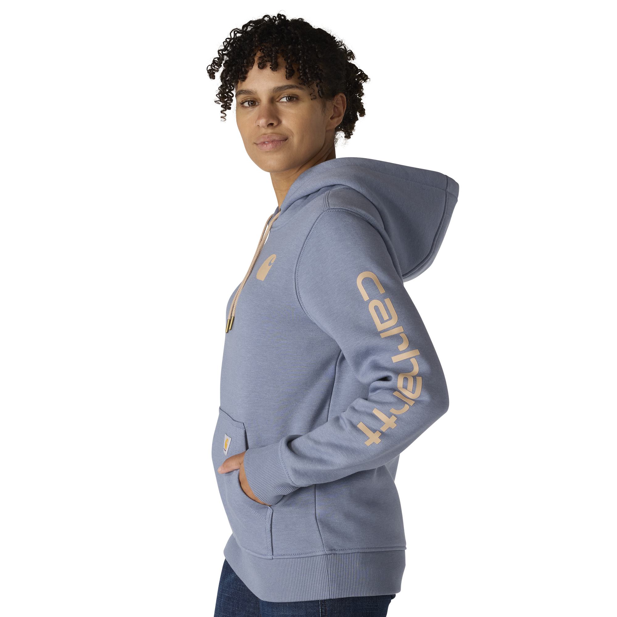 Cold winter mornings are a lot more comfortable with this women's cozy hoodie. Made of heavyweight fleece, the sweatshirt is brushed on the inside for extra softness. It has a relaxed fit that allows for easy layering, and it's finished with a Carhartt logo down the sleeve.
