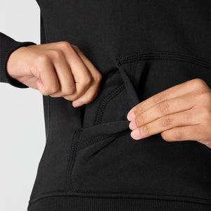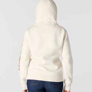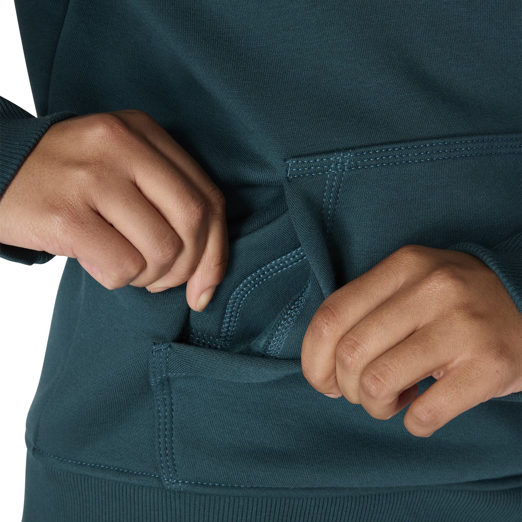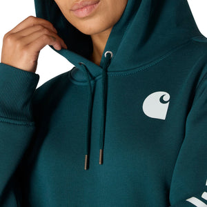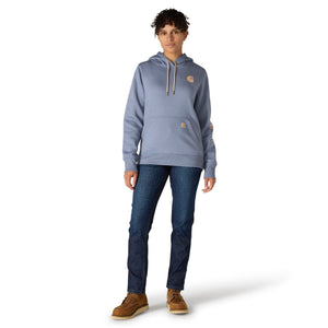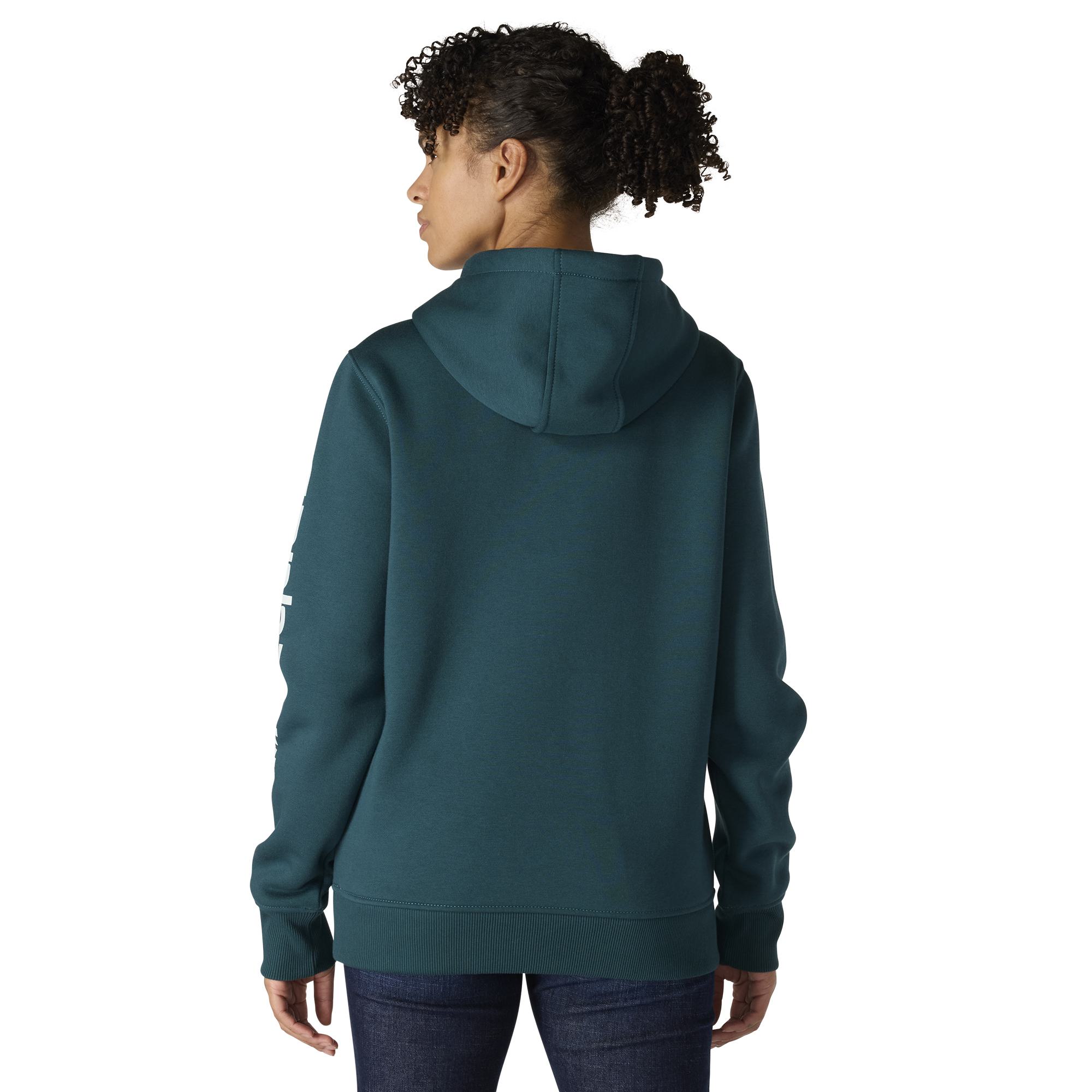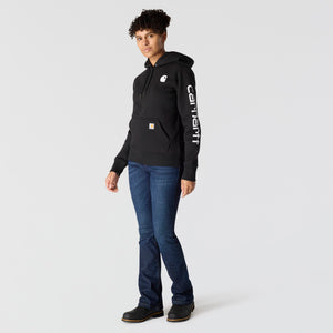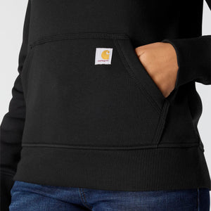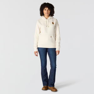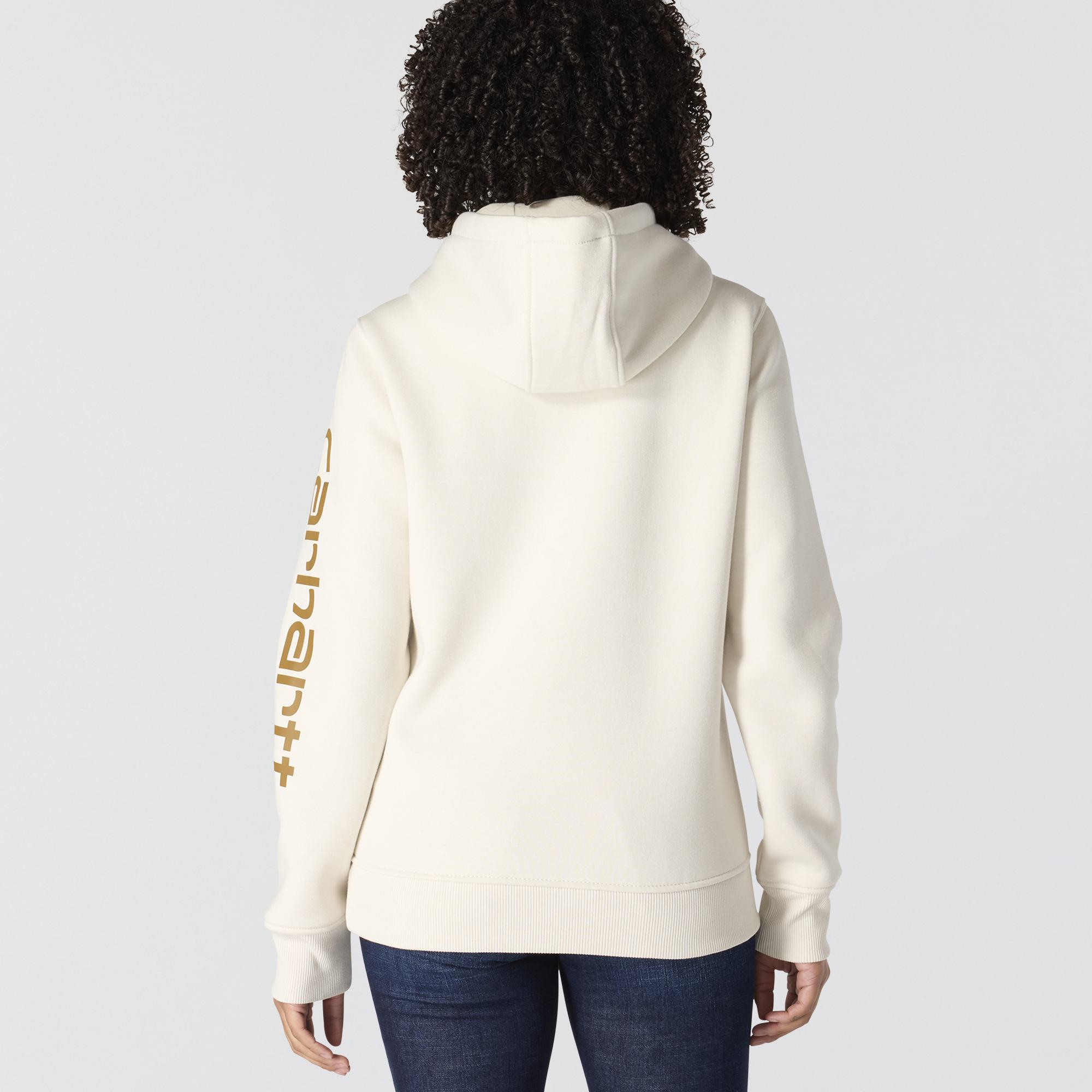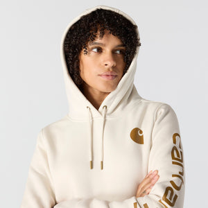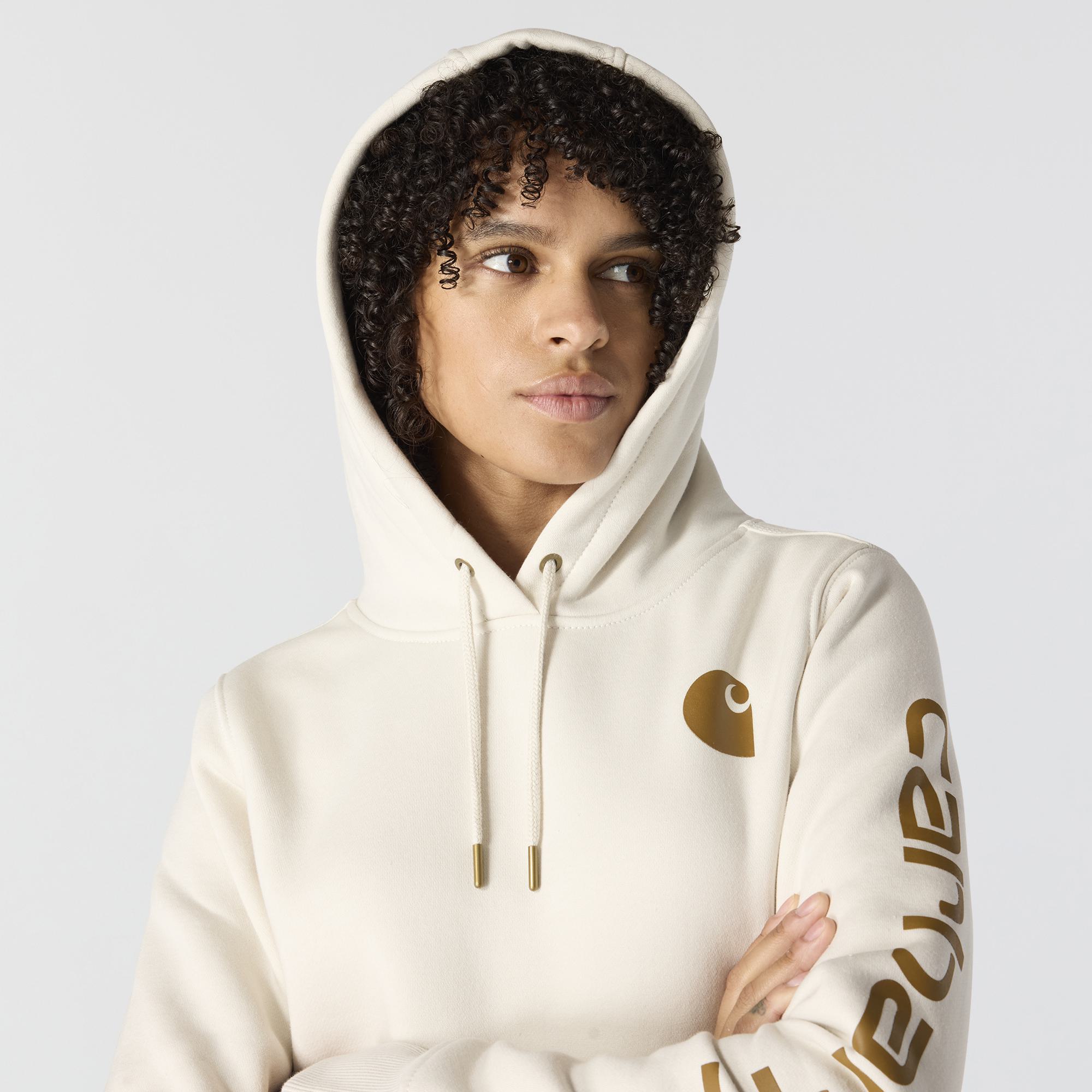 Cold winter mornings are a lot more comfortable with this women's cozy hoodie. Made of heavyweight fleece, the sweatshirt is brushed on the inside for extra softness. It has a relaxed fit that allows for easy layering, and it's finished with a Carhartt logo down the sleeve.