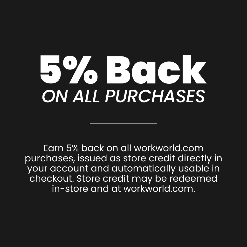 Make sure you're logged into your account at WorkWorld.com or check in at the register when shopping in-person. You’ll earn 5% cash back on all qualifying purchases. Cash back rewards don't apply to gift card purchases.