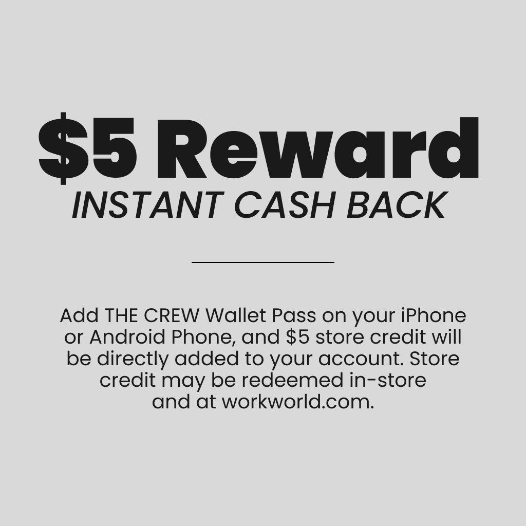 Joining the CREW is free and gives you a direct line to cash back both in-store and online at Workworld.com. From the job site to the shop, our loyalty rewards are designed to help you save on the professional-grade gear you need to get the job done. If you’re looking for a workwear store that gives back, sign up today, download your digital wallet pass, and start racking up CREW Cash on the most durable boots and clothing in the business.