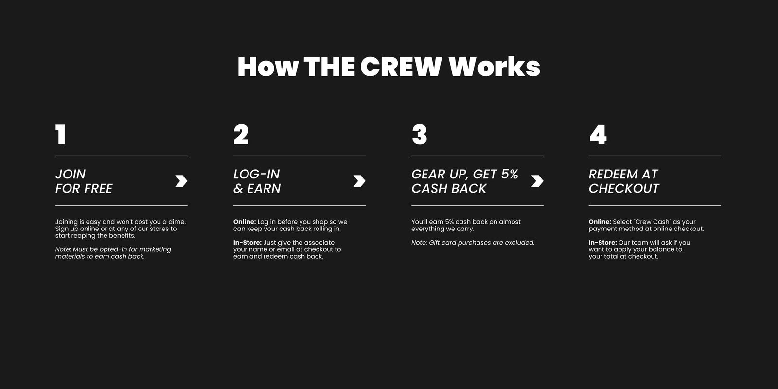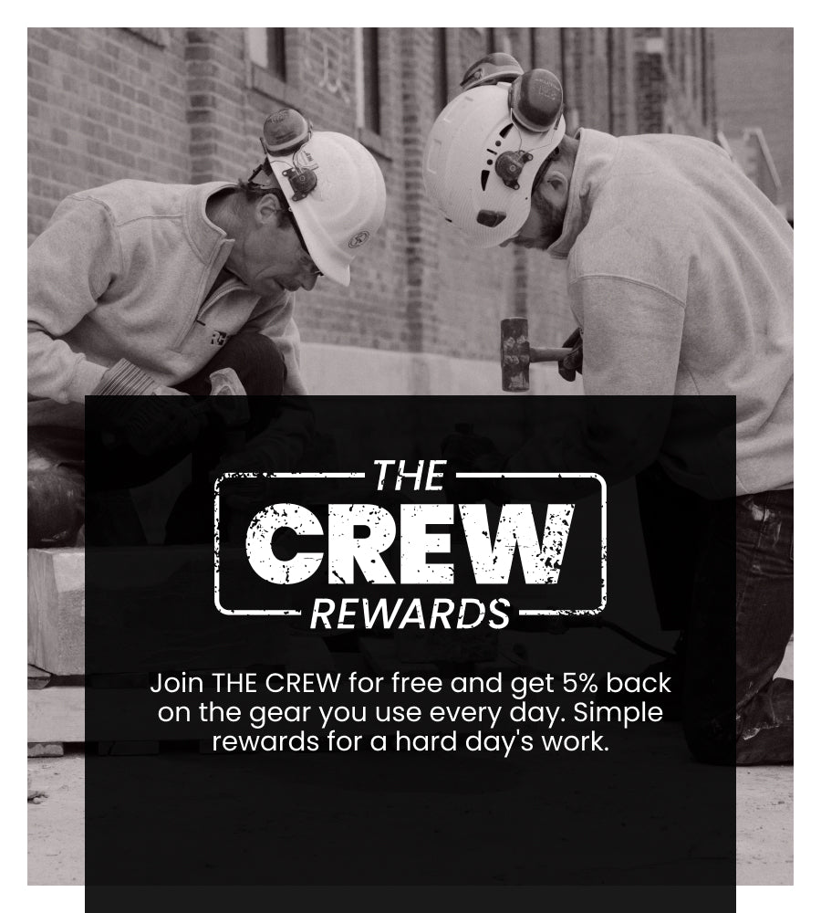 THE CREW Rewards program is our free loyalty program built for hardworking customers like you. Members earn 5% cash back on all qualified purchases at Workworld.com or in-store. It’s a straightforward way to get rewarded for the gear you need.