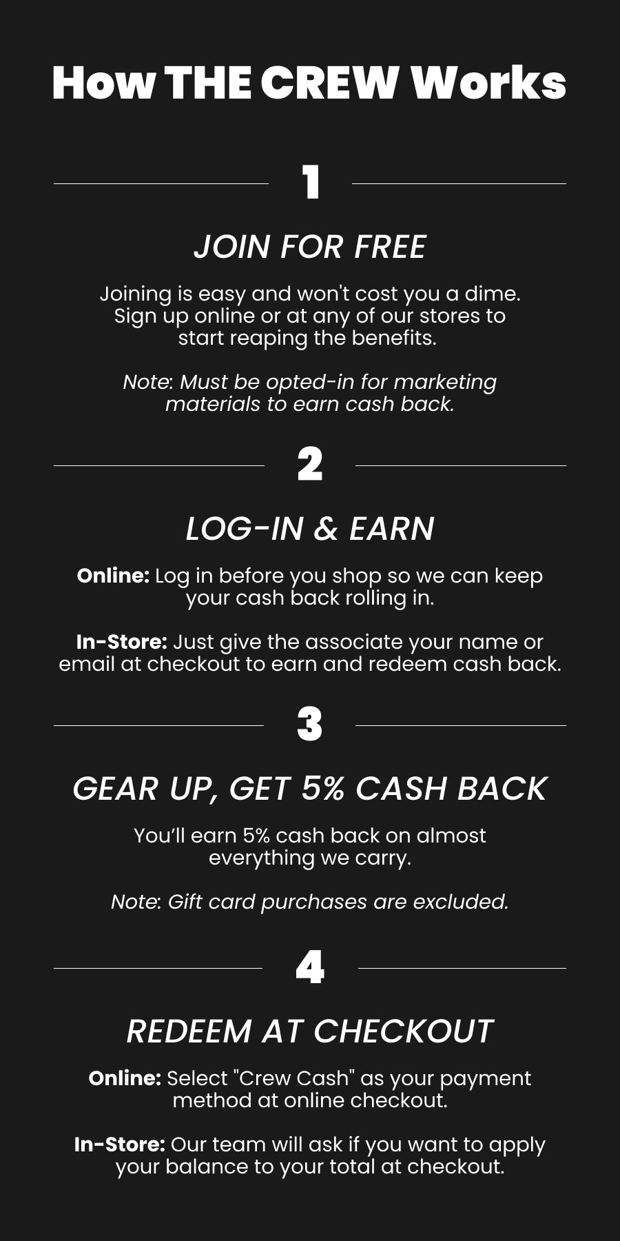 Joining is easy and free, simply signup above to start earning 5% cash back on all qualified purchases on Workworld.com and in-store. In order to earn cash back in THE CREW you must agree to receive marketing messages. You may unsubscribe at any time.