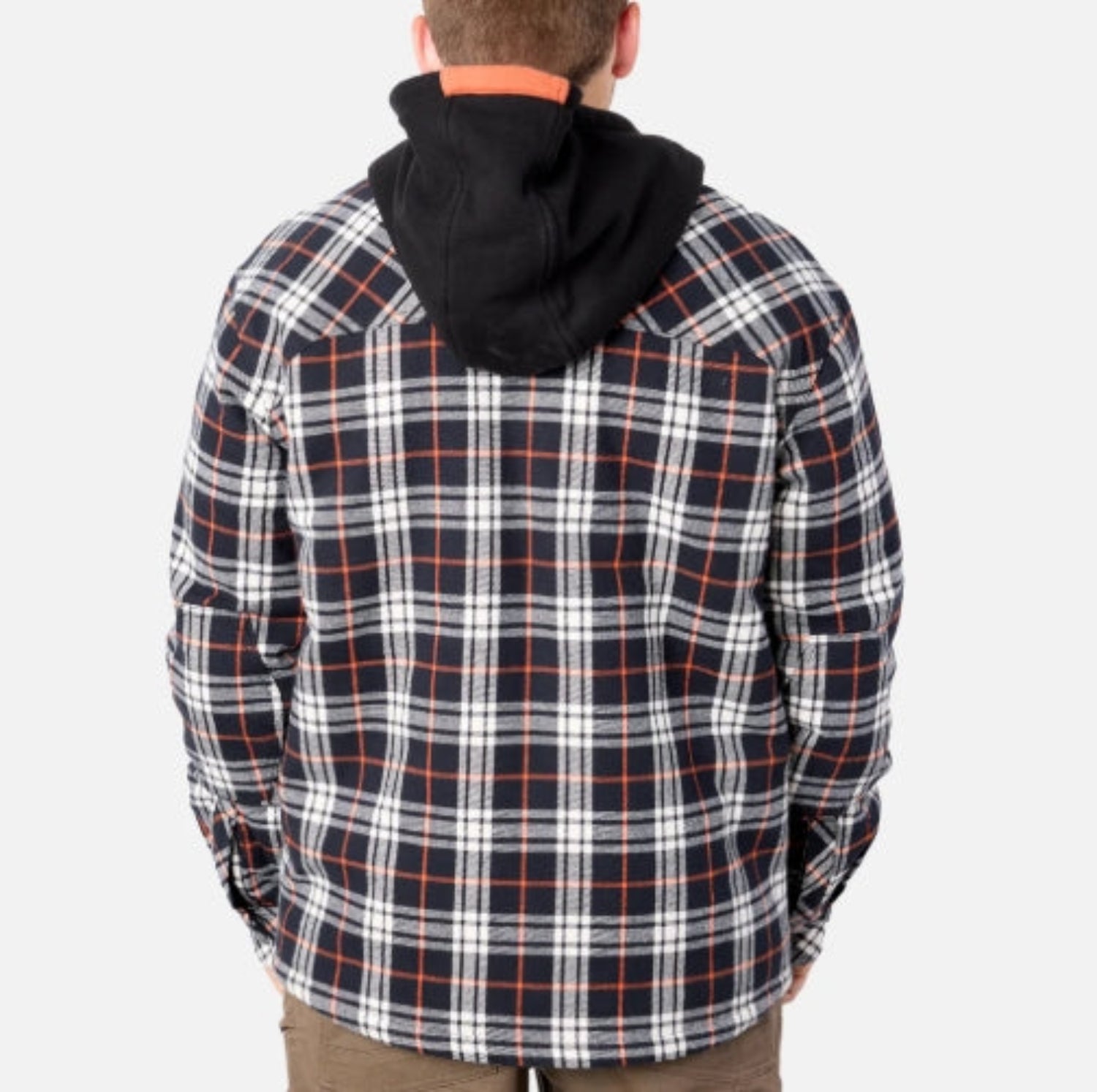 The hooded BRUNT Flannel Jacket is built with a heavy-duty and abrasion-resistant 8.5 oz 92/8 cotton/spandex blend, and a custom quilted sherpa lining and 80g insulation to keep you warm and protected on the jobsite. It comes equipped with a hard hat-compatible hood, kangaroo handwarmer pockets, double-layer elbows, and slick lined sleeves for easy on and off.