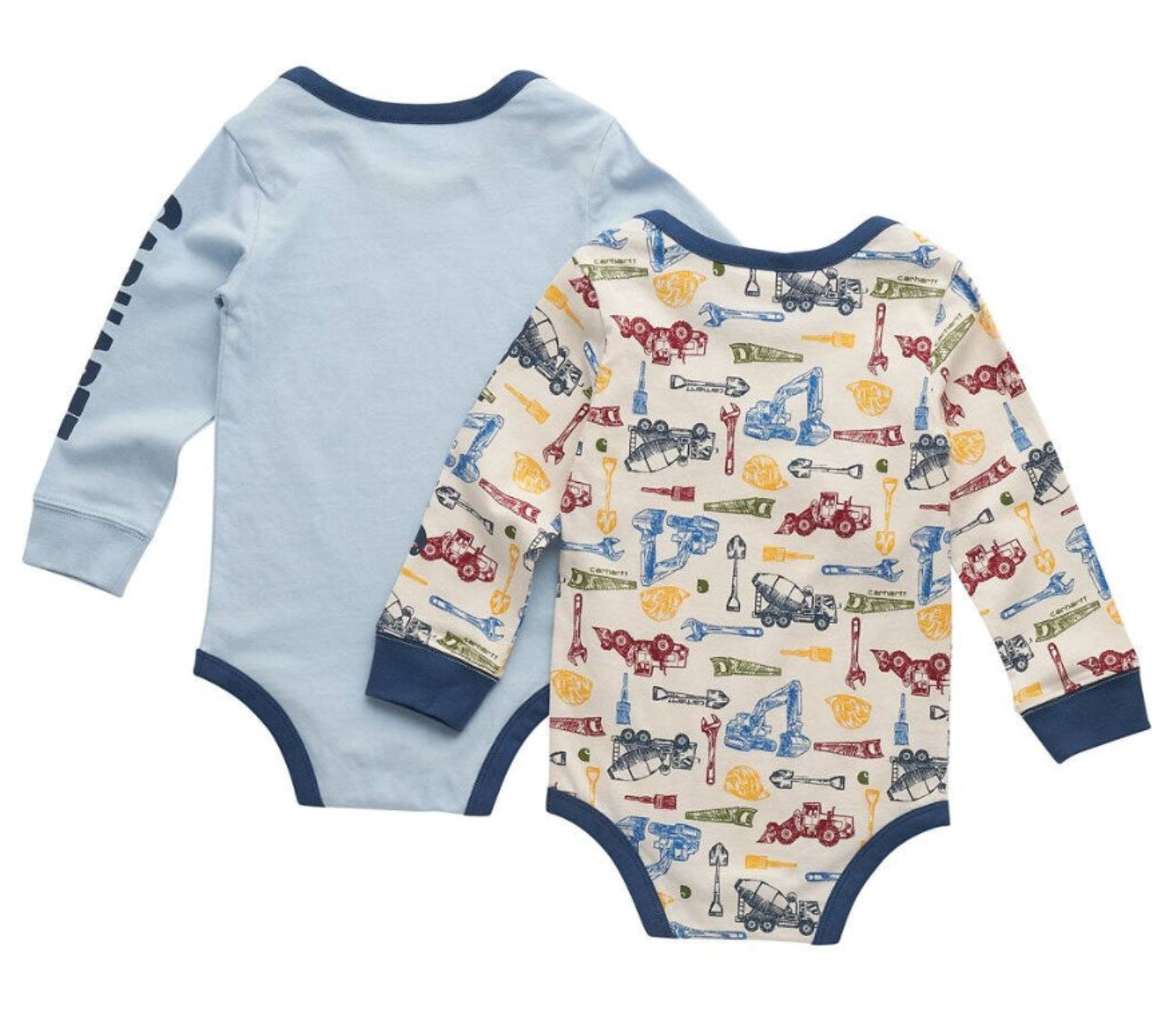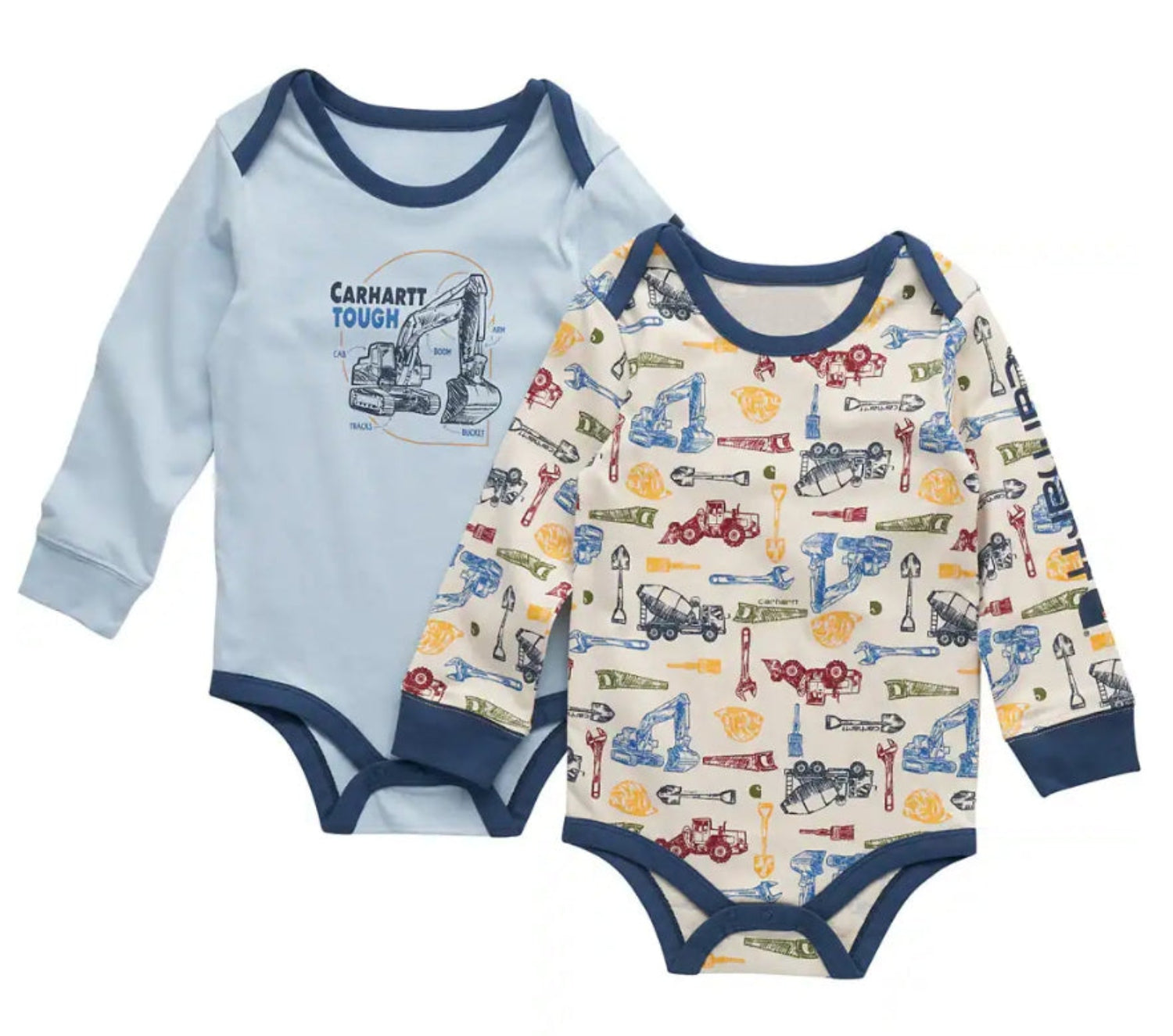 Start him off right with this baby boys' two-piece coverall set. Both are built Carhartt tough to stand up to all of his adventures. Both have snaps to make quick changes fast and easy. And both have construction designs because what kid doesn't love a good excavator?