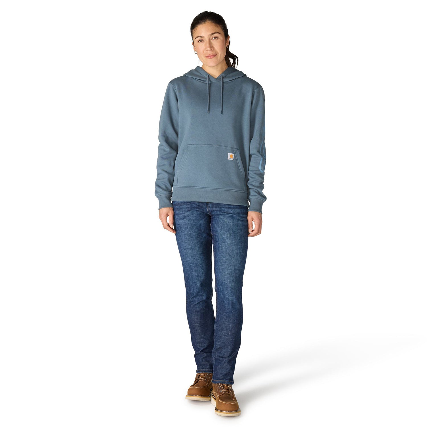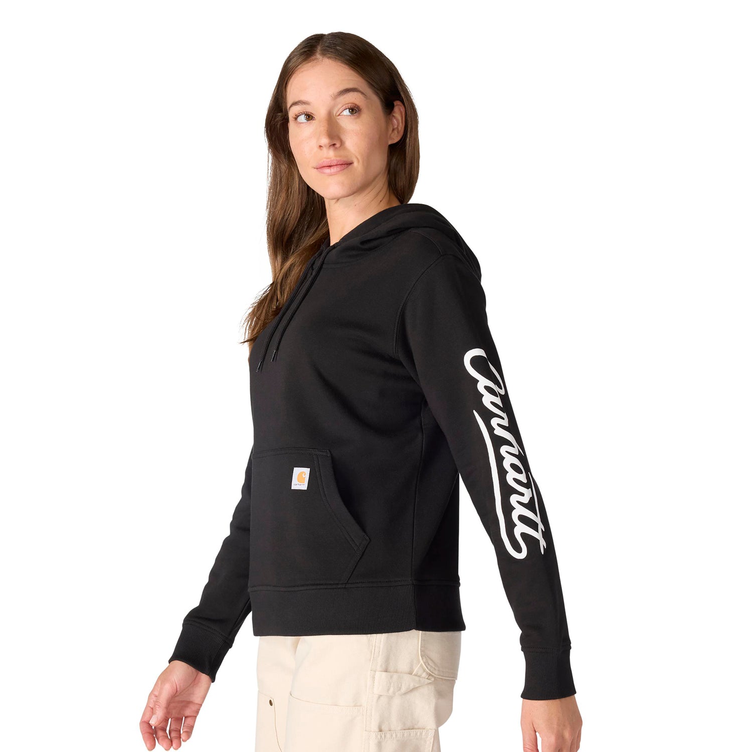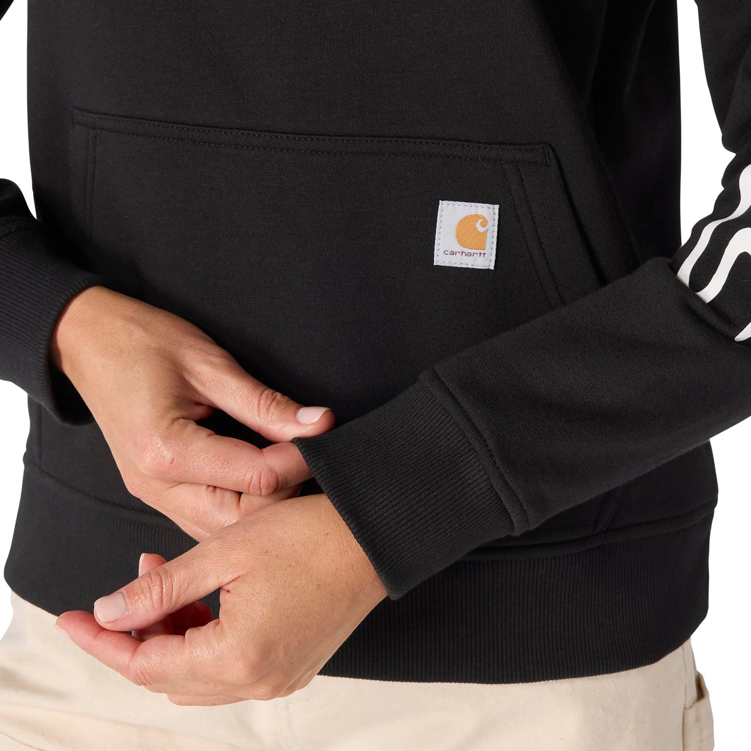 Show your Carhartt pride in this women's hooded sweatshirt featuring graphics on the sleeve. It's built from a lightweight cotton-blend fleece with a ribbed hem and cuffs that hold their shape. Made for casual comfort with a relaxed cut and three-piece hood.