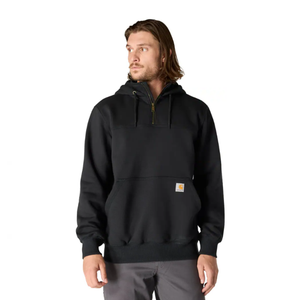 Don't let a little wet weather deter you. This men's quarter-zip hoodie provides the familiar comfort of a favorite sweatshirt with the added benefit of keeping you dry in light rain. With a hidden security pocket inside one of the two handwarmer pockets and boasting Carhartt's water-repellant Rain Defender® treatment, this feature-rich sweatshirt will become your new workwear staple. Formerly known as the Paxton Heavyweight Hooded Zip Mock Sweatshirt.