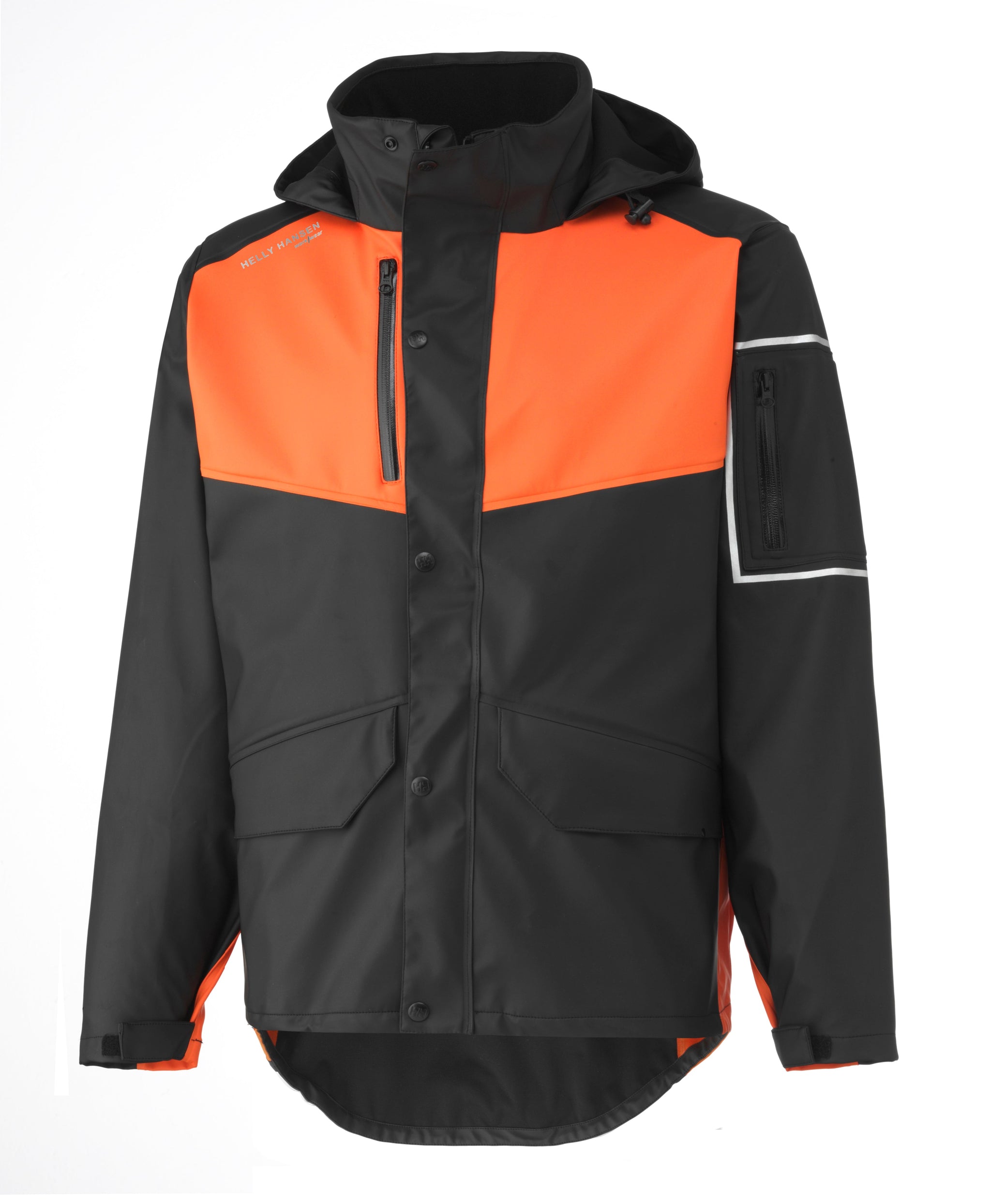 This waterproof jacket is constructed of PU-coated knitted polyester and features a fleece inside collar for extra warmth. The hood has drawcord and Velcro® adjustments, and an opening in the back of the jacket allows for ventilation. Features two hand pockets with flap closures, one chest pocket with zip closure, and one sleeve pocket with zip closure. Also features a storm flap with zip closure and a Velcro® adjustment on the bottom hem of each sleeve.