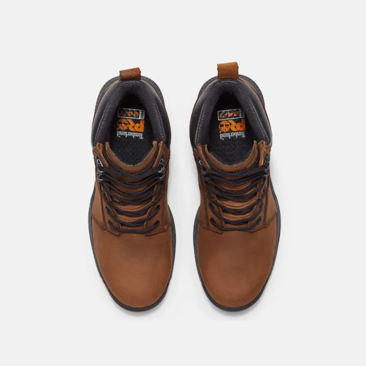 The future of comfort has arrived and it’s ready for hard work. Engineered for safety and performance with steel safety toes, electrical hazard protection, contoured shock diffusion plates for structural support, and full-grain, Premium Timberland® leather uppers. Next, we added our Timberland PRO® 24/7 Comfort Suspension System™ technology that not only meets rigorous worksite demands, it also helps reduce foot fatigue by supporting your arch and cushioning every step. Go all day in the lightweight, cushioning support of the EVA midsoles, breathable OrthoLite® comfort foam insoles designed to not lose cushioning over time, and breathable, moisture-wicking linings with antimicrobial treatment for odor control. Underneath, you'll find heat-, oil-, slip-, and abrasion-resistant, non-marking Timberland PRO® rubber outsoles designed for traction with Ladder Lock™ heels that help grip ladder rungs.